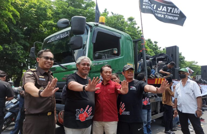 Peringatan Hari Antikorupsi Sedunia (HAKORDIA) 2025 di Surabaya berlangsung berbeda. Ratusan anggota Masyarakat Anti Korupsi Indonesia (MAKI) Jawa Timur menggelar aksi damai dengan konvoi menggunakan truk kontainer terbuka menuju Kantor Kejaksaan Tinggi (Kejati) Jawa Timur, Rabu (9/12/2025). Aksi tersebut dipimpin langsung Ketua MAKI Jatim, Heru Prasetiyo.