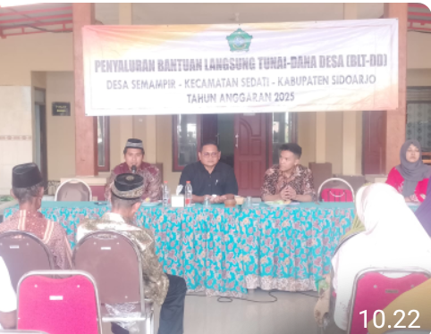 Pemerintah Desa Semampir, Kecamatan Sedati, Kabupaten Sidoarjo kembali merealisasikan penyaluran Bantuan Langsung Tunai Dana Desa (BLT-DD) Tahap IV Tahun Anggaran 2025. Bantuan ini diberikan kepada 36 Keluarga Penerima Manfaat (KPM) untuk periode Oktober, November, dan Desember. Penyaluran berlangsung pada Kamis, 11 Desember 2025 di Pendopo Balai Desa Semampir.