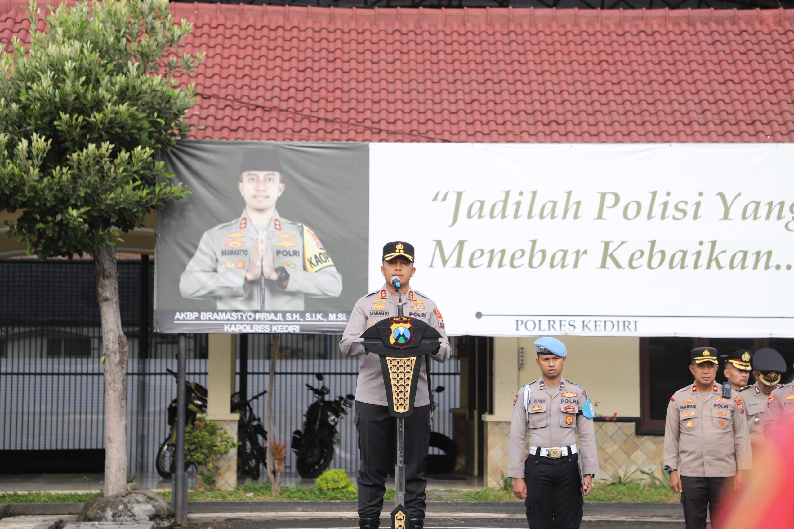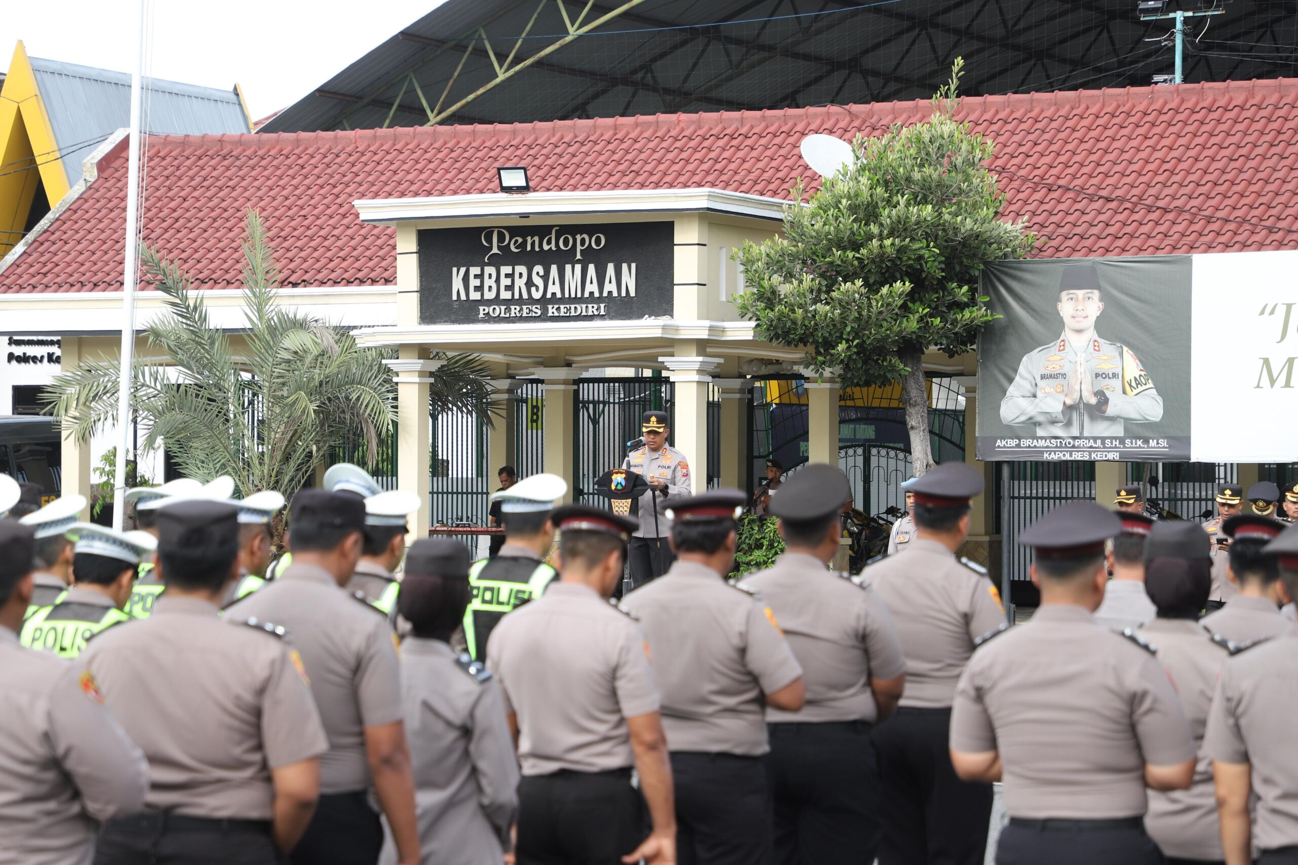 Apel dipimpin Kapolres Kediri AKBP Bramastyo Priaji, S.H., S.I.K., M.Si. serta diikuti Wakapolrea Kediri, para Pejabat Utama (PJU), Kapolsek jajaran, dan seluruh personel Polres Kediri.