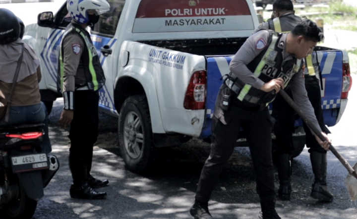 Saat mendapati kondisi aspal yang berlubang dan dinilai berpotensi membahayakan keselamatan pengguna jalan, petugas langsung mengambil tindakan. Tanpa menunggu lama, anggota Timsus Satlantas Polres Gresik secara swadaya mengupayakan material dan melakukan penambalan darurat pada titik-titik kerusakan tersebut.