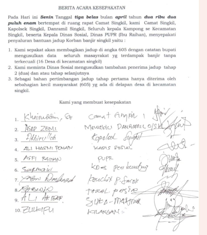 Berita Acara tersebut terlihat dalam daftar hadir adalah Camat Singkil, Kapolsek Singkil, Danramil Singkil, Kepala Dinas Sosial, Perwakilan Dinas PUPR (Ibu Raihan) dan Seluruh Kepala Kampong (Kepala Desa) se-Kecamatan Singkil. Senin (13/04/2026).