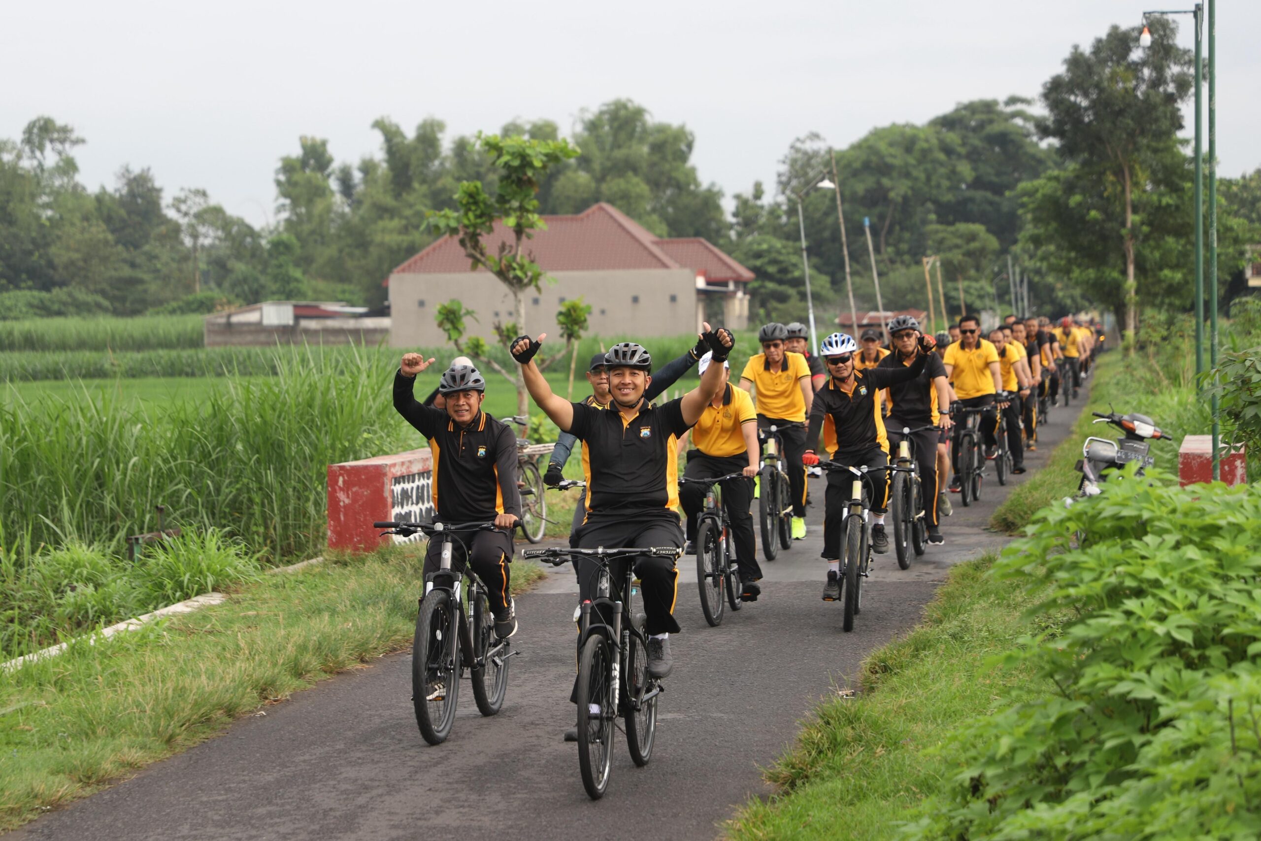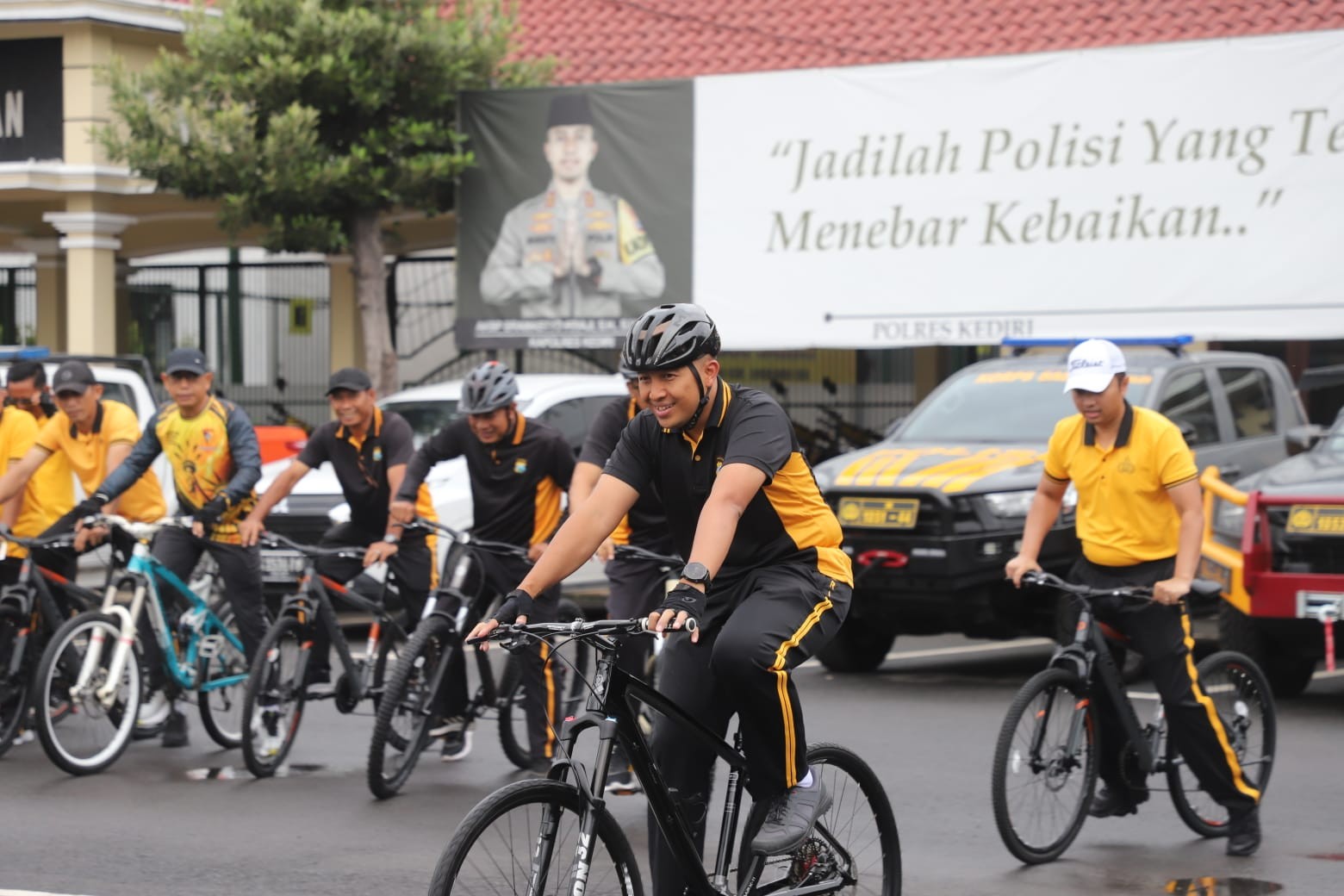 Kapolres Kediri AKBP Bramastyo Priaji, S.H., S.I.K., M.Si., bersama jajaran personel Polres Kediri mengikuti kegiatan olahraga gowes dengan rute datar (flat) mengelilingi kawasan tersebut.