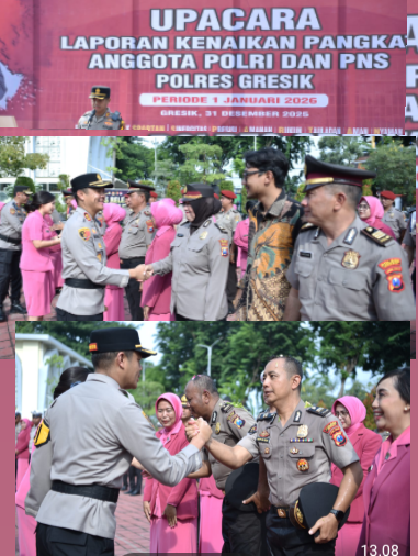 GRESIK – Menjelang pergantian tahun, Kapolres Gresik AKBP Rovan Richard Mahenu, memimpin langsung Upacara Laporan Kenaikan Pangkat bagi personel Polri periode 1 Januari 2026 serta Pegawai Negeri Sipil (PNS) periode 1 Oktober 2025, Rabu (31/12/2025) di Halaman Mapolres Gresik.