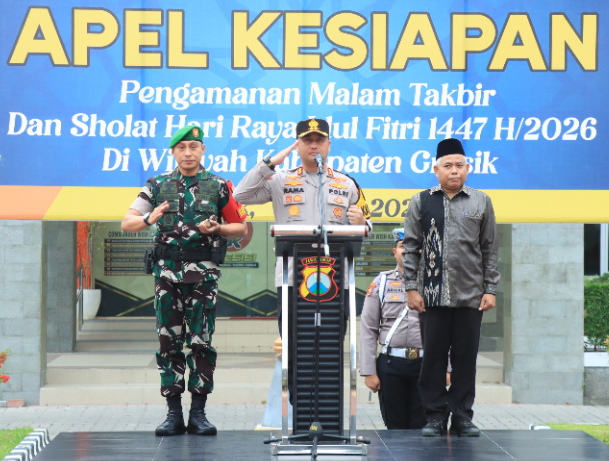 GRESIK – Kapolres Gresik, AKBP Ramadhan Nasution, memimpin langsung Apel Kesiapan Pengamanan Malam Takbir dan Salat Hari Raya Idulfitri 1447 H/2026 yang digelar di halaman Mapolres Gresik, Jumat (20/3/2026) sore.