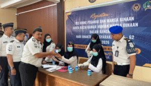 SIDOARJO Senin (6/4/2026) — Lembaga Pemasyarakatan Kelas IIA Sidoarjo menggelar kegiatan tes urin bagi seluruh pegawai dan warga binaan yang dilaksanakan di aula kunjungan Lapas Sidoarjo. Kegiatan ini diikuti oleh seluruh petugas dan warga binaan sebagai bentuk komitmen bersama dalam menciptakan lingkungan pemasyarakatan yang bersih dari penyalahgunaan narkoba, serta turut dihadiri oleh aparat kepolisian guna memastikan pelaksanaan berjalan aman dan tertib.