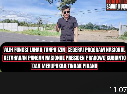 “Alih fungsi lahan pertanian tanpa prosedur dan izin yang sah merupakan pelanggaran hukum. Pasal 44 dan Pasal 72 UU Nomor 41 Tahun 2009 secara jelas menyatakan ancaman hukuman dengan penjara minimal lima tahun dan denda satu milyar rupiah. Hal ini bukan perkara yang bisa dianggap remeh,” ujar Sugiarto kepada awak media pada Sabtu, 27 Desember 2025.