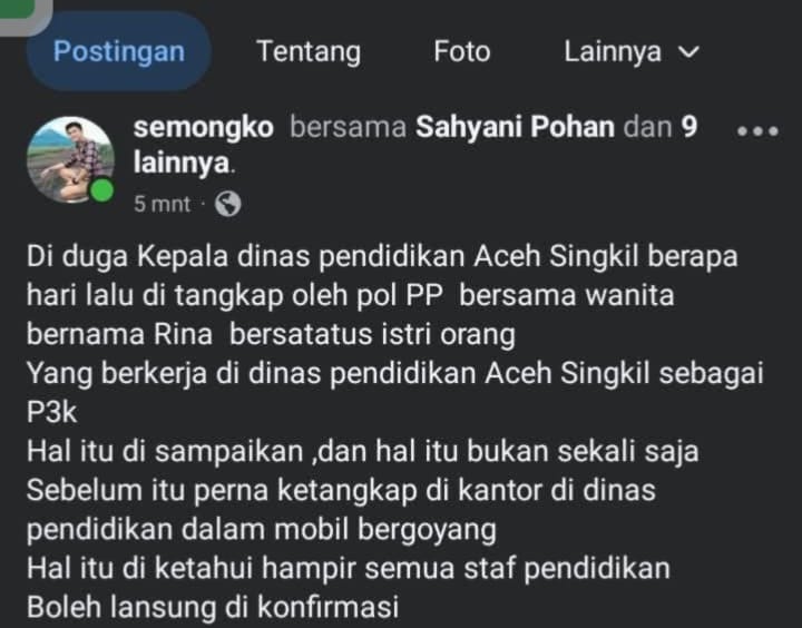 Dalam unggahan tersebut, disebutkan adanya dugaan bahwa Kepala Dinas Pendidikan Aceh Singkil beberapa hari lalu diamankan oleh Satuan Polisi Pamong Praja (Satpol PP) ,bersama seorang perempuan bernama Rina, yang disebut berstatus sebagai istri orang dan bekerja di Dinas Pendidikan Aceh Singkil sebagai tenaga PPPK.